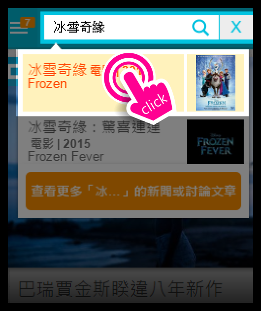 搜尋教學假設提示是「艾莎 / let it go / 雪寶 (電影)」,請在搜尋工具上打上答案「冰雪奇緣」,並點選「冰雪奇緣」。