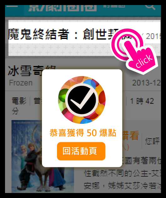 進入到「冰雪奇緣」電影資料頁後,頁面最上方有「尋找爆爆 周年慶」 banner,按下「點我集爆點換好康」,即可獲得 50 爆點。